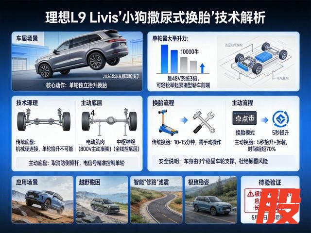 在2026年北京车展的理想展台上,发生了一件让围观者忍不住掏出手机录像的事:一辆庞大的理想L9 Livis稳稳停住,随后它的右后轮在几秒内独自抬了起来,车身随之倾斜,像极了小狗抬腿撒尿。